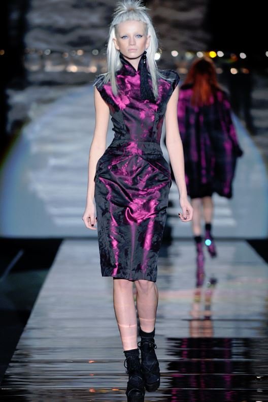 Así, peinados neopunk, maquillaje pastoso, cuñas basadas en los tradicionales Okobo japoneses y apetecibles bolsos con borla, en definitiva todo aquello que rodea las prendas, ha sido estudiado al detalle y el diseñador no ha dejado lugar a la improvisación con el fin de crear una estética firmemente definida. ¿Lo mejor? Sin duda esos maravillosos abrigos oversize –algunos con patrones capa, otros a modo de batín años 20 de inspiración Paul Poiret y con cortes Kimono- trufados de metalizados, pan de oro y plata, y con algunas escuetas alusiones al punto grosso en mangas abullonadas de campana.