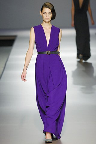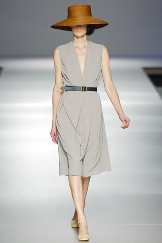 La paleta cromática no ha sido amplia, apenas grises, lilas y arenas. Tan sólo los estampados geométricos en azul o negro sobre crudo han aportado una nota muy sutil de color en forma de vestidos camiseros o tipo túnica de crêpe de China.